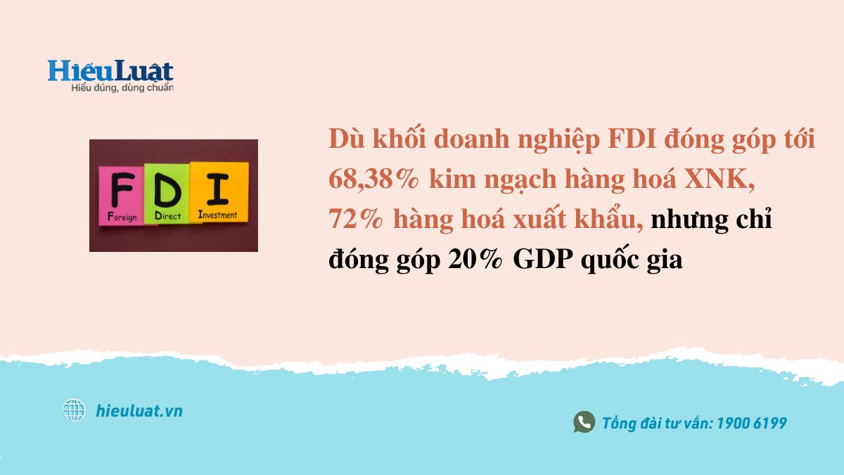 Kết luận: Dù khối doanh nghiệp FDI đóng góp tới 68,38% kim ngạch hàng hoá xuất nhập khẩu, 72% hàng hoá xuất khẩu, nhưng chỉ đóng góp khoảng 20% GDP quốc gia.